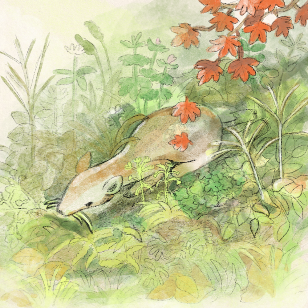 冬に備えて草をもぐもぐしている鹿を描きました